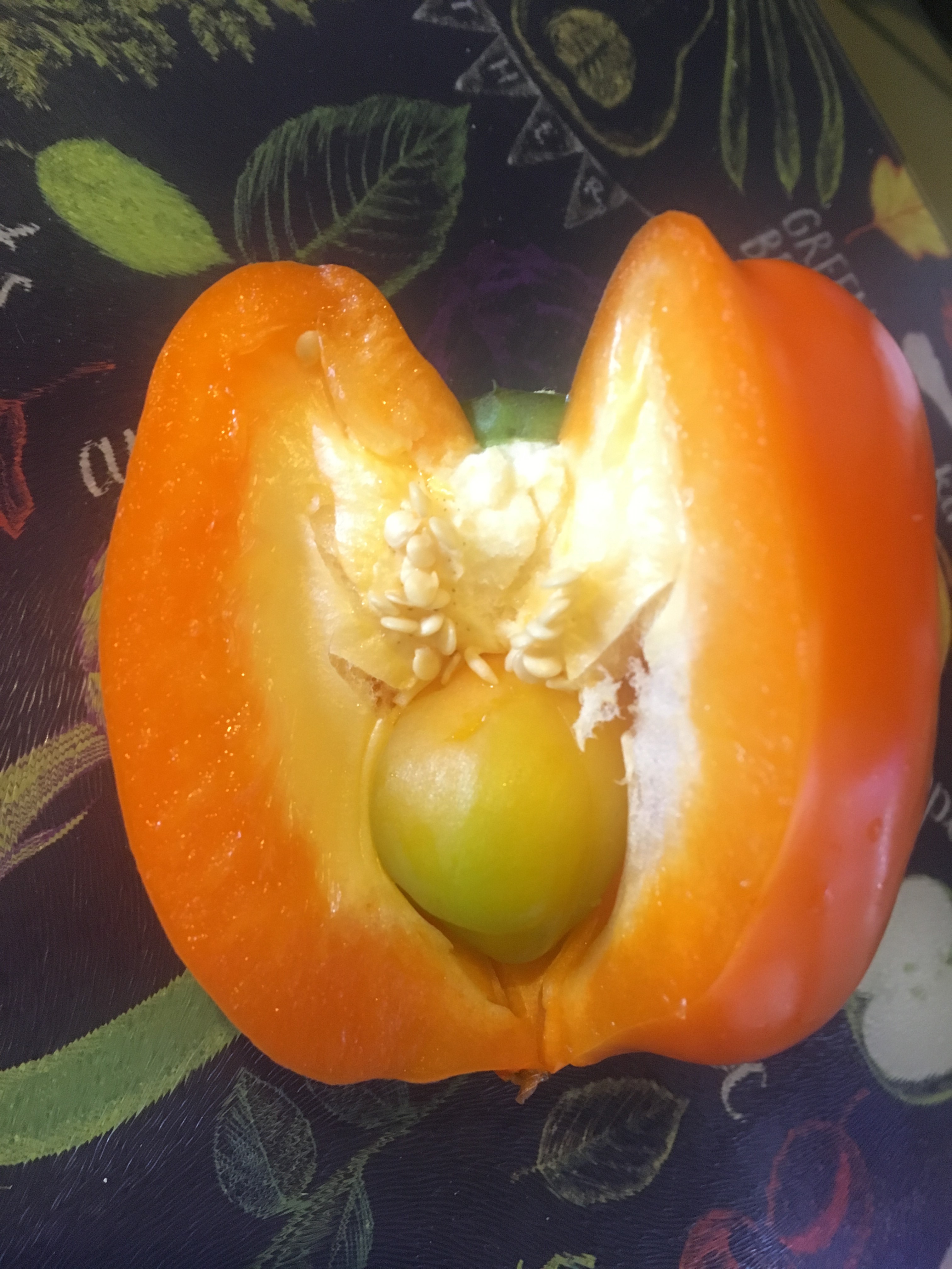 I cut open this gorgeous pepper today for my lunch and was gifted with this little baby pepper inside. I immediately had to show Michele, and we whispered to each other (as if we were going to wake a sleeping baby) how cute it was. I don’t believe in coincidences and I fully believe the universe has a sense of humor.